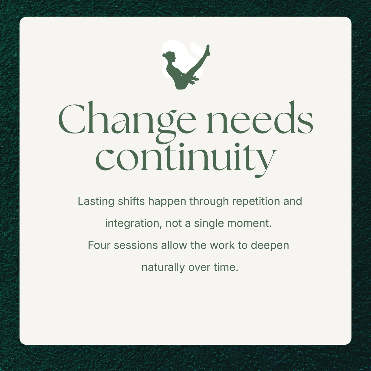 Sessions build on one another, allowing insights and shifts from earlier sessions to deepen over time. This structure helps changes feel natural, integrated, and sustainable rather than forced or temporary.